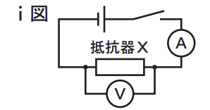 〈実験Ⅰ〉 電源装置,抵抗器X,電圧計,電流計,スイッチを用いて,右のⅰ図の回路図で表される回路をつくる。電源装置の電圧をさまざまに変えて,抵抗器Xに加わる電圧の大きさと流れる電流の大きさをそれぞれはかる。