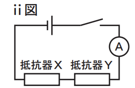 〈実験Ⅱ〉 電源装置,抵抗器X,電気抵抗の大きさが 10Ωの抵抗器Y,電流計,スイッチを用いて,右のⅱ図の回路図で表れる回路をつくる。電源装置の電圧の大きさを 3.0 V にし,回路全体に流れる電流の大きさをはかる。