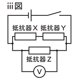 〈実験Ⅲ〉 電源装置,抵抗器X,電気抵抗の大きさが 10Ωの抵抗器Y,電気抵抗の大きさが 20Ωの抵抗器Z,電圧計,スイッチを用いて,右のⅲ図の回路図で表される回路をつくる。電源装置の電圧の大きさを 4.5 V にし,抵抗器Zに加わる電圧の大きさをはかる。
