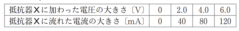 〈実験Ⅰ〉の結果,抵抗器Xに加わった電圧 の大きさと流れた電流の大きさの関係をまとめると,右の表のようになり,抵抗器Xに流れた電流の大きさは,抵抗器Xに加わった電圧の大きさに比例していることがわかった。