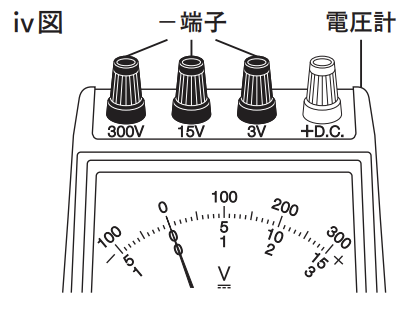 (1) 下線部電圧計について,ⅳ図は,300 V,15 V, 3 V の-端子がある電圧計の一部を表したものである。ⅳ図で表される電圧計を用いて,ある 部分に加わる電圧の大きさをはかるとき,電源装置の-極側の導線を電圧計 の 15 V の端子につないだ場合,最小目盛りが表す電圧の大きさとして最も 適当なものを,次の(ア)~(エ)から 1 つ選べ。