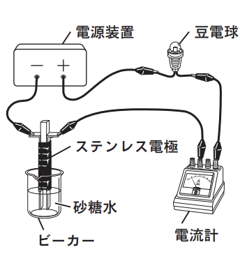 操作Ⅱ 図のように,電源装置,ステンレス電極,電流計,豆電球をつなぎ,砂糖水に電極を入れてから 6 V くらいの電圧を加え,豆電球が光るかどうかを調べる。また,電極付近のようすを観察する。