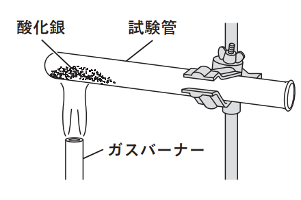 酸化銀 2.90 g をはかりとり,試験管に入れた。次に,右の図のような装置で,酸化銀が完全に熱分解されるまでガスバーナーで十分に加熱した。ガスバーナーの火を消して試験管が十分に冷めてから,試験管の中に残った物質をとり出して質量をはかると,試験管の中に残った物質の質量は2.70 g であった。質量をはかった後,試験管からとり出した物質を押し固め,薬さじの裏側でこすると,金属光沢が見られた。酸化銀はこのような性質を示さないため,酸化銀は加熱することで別の物質に変化すると考えられる。