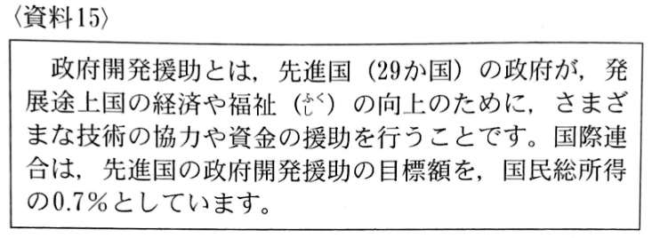 (7) 資料15のように、国連は先進国の政府開発援助額の目標額を国民総所得の0.7%と定めているにもかかわらず, 資料17のように日本の国民総所得に占める政府開発援助額の割合は163億ドル) ÷51,564 (億ドル)=おおよそ 0.3%にすぎない点に着目する。
