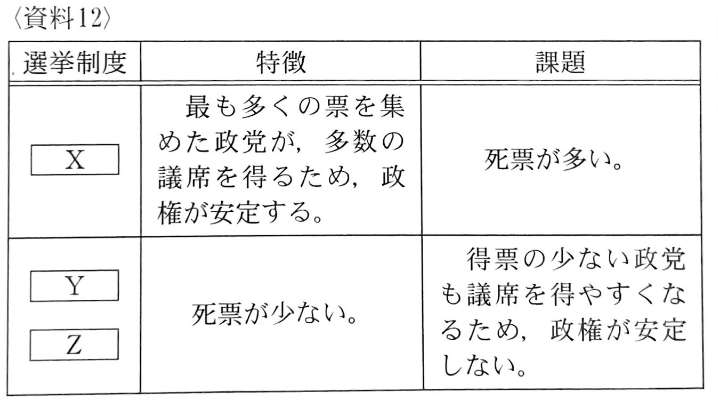 (b)ひふみさんは,資料9の投票結果で曲Aに決定した場合曲Bと曲Cに投票された票は, 以前に学習した,選挙における死票にあたるのではないかと考え, 公民的分野のノ ー トを見直した。 資料12は,ひふみさんの 公民的分野のノートの一部である。 資料12の【X】にあてはまる選挙制度はどれか,あとのア~エから最も適当なものを1つ選び,その記号を書きなさい。