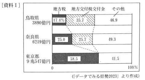 (2)健太さんは,下線部Bの財政について調べる中で,資料Ⅰを見つけた。資料Ⅰは,2020年度におけ る鳥取県,奈良県,東京都の歳入額とその内訳を示したものである。後の【 】内は,健太さんが,資料Ⅰを 見て気付いたことをまとめたメモである。(R)に当て はまる言葉を簡潔に書け。
