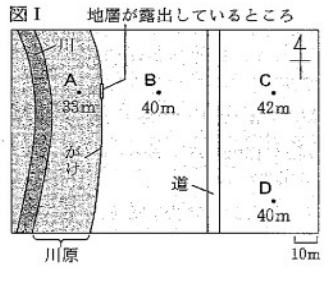 (8) Uさんが調べた地域では、BC間の地層の境界面は、東に向かって一定の傾きで下がっており、CD間の地層の境界面は、南に向かって一定の傾きで下がっていることが分かっている。 BC間の地層の境界面の傾きの角度と、CD間の地層の境界面の傾きの角度が等しいと仮定した場合、図Ⅰ中のD点では、地表面から何m 真下に掘り進めれば、 火山灰の層が現れると考えられるか、 求めなさい。 答えは整数で書くこと。ただし、 れきの層を除いたすべての地層について、 それぞれの厚さはB点、C点、D点の各地点で同じであり、この地域には断層などによる地層のずれやしゅう曲はないものとする。