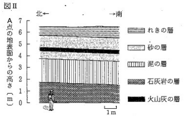 ・図Ⅱは、がけの表面に露出している地層の一部を観察したときのようすを模式的に表したものである。