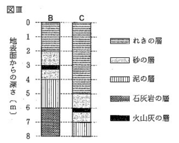 ・図Ⅲは、図Ⅰ中のB点とC点の柱状図である。