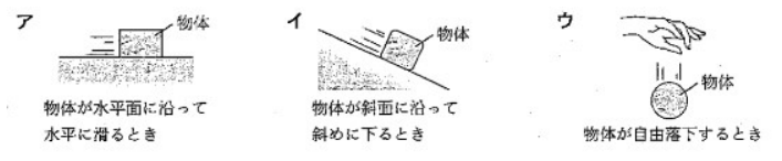 (1) 物体には、真下の向きに重力がはたらく。次のア〜ウのうち、物体にはたらく重力の向きと、物体の運動の向きが同じものはどれか。 一つ選び、 記号を○で囲みなさい。
