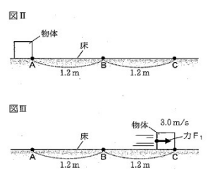 て、物体を力F1 で水平方向に押し続けた。 物体は力F1の向きに進み、 物体が動き始めてから1.6秒後に、 図Ⅲのように物体の前面がCを通過した。物体の前面がAからCに移動する間、 物体の速さはしだいに速くなっていき、図Ⅲのように物体の前面がCを通過したときの物体の速さは3.0m/sであった。ただし、物体の前面がAからCに移動する間、力F1の大きさは一定であったものとする。