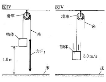 せた。Rさんが糸から手を離すと、物体は真下に落下した。図Vのように、 物体の速さが図Ⅲの物体の速さと同じ3.0m/s になったとき、 物体の底面は床に達していなかった。ただし、糸の質量や、糸と滑車の間の摩擦は考えないものとする。