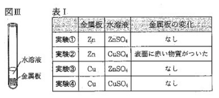 図Ⅲのように、試験管に亜鉛Znまたは銅Cuの金属板を1枚入れ、 硫酸亜鉛ZnSO₄水溶液または硫酸銅CuSO₄水溶液を加えて観察する実験を、 金属板と水溶液の組み合わせを変えて4回行い、実験①〜実験④とした。表Ⅰは、実験①〜実験④において、水溶液を加えてから、 1時間後に金属板を観察した結果をまとめたものである。