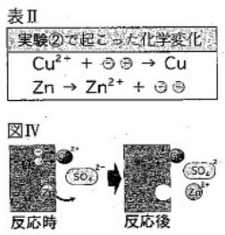 T先生 : はい。 電子1個を⊖と表すと、実験②の亜鉛板の表面では、表Ⅱ中の化学変化が起こり銅が付着しています。図Ⅳは、実験②において、銅イオンが亜鉛板から電子を受け取るようすや、亜鉛原子が亜鉛板に電子を放出するようすを表しています。