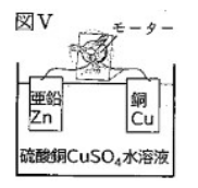 (6) HさんとT先生は、導線を用いてモーターの二つの端子の一方には亜鉛板を、 他方には銅板を接続し、 これらの金属板を図Vのように硫酸銅水溶液に入れた。 するとモーターは回転し始め、10分後にはいずれの金属板の表面にも銅が付着していた。 1時間後には、 モーターは停止しており、 いずれの金属板の表面においても、付着した銅の量は増加していた。 これらの結果から考えられることについて述べた次の文中のd[ ]、e[ ]から適切なものをそれぞれ一つずつ選び、記号を○で囲みなさい。