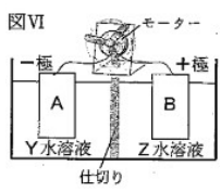 T先生 : その通りです。では、電流を長時間取り出せるように、図Vの装置に改良を加えましょう。図Ⅵのように、素焼きの板またはセロハン(セロファン)の膜でできた仕切りで容器を区切り、亜鉛板と鋼板、硫酸亜鉛水溶液と硫酸銅水溶液を用いると、ダニエル電池ができます。図Ⅵ中のAの板を一極にする場合、 A、B、Y、Zの物質は何であればよいですか。