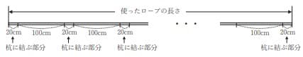 Fさんは、杭を100cm間隔で打ってロープを張ることにした。図Ⅰは、Fさんが使ったロープを表す模式図である。 「杭の本数」が2本のとき「使ったロープの長さ」は140cmであるとし、 「杭の本数」が1本増えるごとに「使ったロープの長さ」は120cmずつ長くなるものとする。(これを【Fさんの張り方】 とする。)