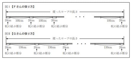 体育祭の準備のため、FさんとGさんはどれぞれグラウンドで先生と一緒に、杭を打ってロープを張ることになった。ロープは、それぞれの杭の上部にある輪に結びながら張っていく。杭に結ぶロープの長さは全て20cmであり、ロープはたるみなく張るものとする。