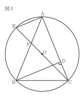 [Ⅰ]図Ⅰにおいて、A、B、Cは点Oを中心とする円の周上の異なる3点である。 3点A、B、Cを結んでできる△ABCはAB=ACの二等辺三角形であり、頂角∠BACは鋭角である。 D は、Bから線分ACにひいた垂線と線分ACとの交点である。 Eは、 直線 OC と円Oとの交点のうちCと異なる点である。 Fは、線分 EC と線分ABとの交点である。EとAとを結ぶ。