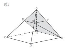 [Ⅱ]図Ⅱにおいて、立体 ABCDE は四角すいであり、 直線AB は平面 BCDEと垂直である。AB=3cmである。 四角形BCDE は長方形であり、 BC = 5cm、BE=4cmである。 Fは、辺AE上の点である。 Gは、Fを通り辺 DE に平行な直線と辺AD との交点である。 GとEとを結ぶ。 Hは、Gを通り辺 CD に平行な直線と辺 AC との交点である。 HとBとを結ぶ。