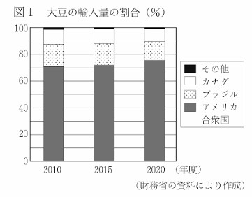 ② Kさんは、日本における大豆の自給率や輸入量に興味をもち、調べた。表Ⅰは、2010(平成22)年度から2020(令和2)年度までの5年ごとにおける、日本の大豆の自給率を示したものである。図Ⅰは、2010年度から2020年度までの5年ごとにおける、日本の大豆の総輸入量に占める国別の輸入量の割合をそれぞれ示したものである。あとの文は、表Ⅰ、図Ⅰをもとに、Kさんがまとめたものの一部である。文中の( )に入れるのに適している内容を、「自給率」「アメリカ合衆国」の2語を用いて簡潔に書きなさい。