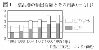 図Ⅰより、1884年から1889年までの期間の横浜港における輸出総額が増加したことが読み取れる。この期間の横浜港における生糸と生糸以外それぞれの輸出額の推移を比べて考えると、おもに( )ことによって輸出総額が大きく増加したといえる。