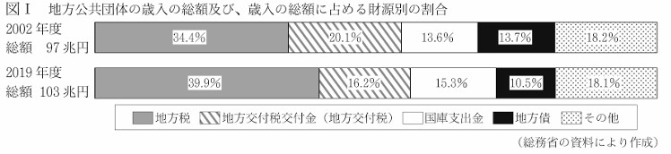② 国や地方公共団体の税金などによる1年間の収入は歳入と呼ばれている。図Ⅰは、2002(平成14)年度と2019(令和元)年度における、全国の地方公共団体の歳入の総額及び、歳入の総額に占める財源別の割合を地方税、地方交付税交付金(地方交付税)、国庫支出金、地方債に分けてそれぞれ示したものである。あとのア〜エのうち、図Ⅰから読み取れる内容についてまとめたものとして正しいものはどれか。一つ選び、記号を○で囲みなさい。