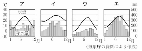 (a) 長野県松本市の気候は内陸(中央高地)の気候の特徴をもつ。下のア〜エのグラフは、高知市、那覇市、福井市、松本市それぞれの気温と降水量を表したものである。内陸(中央高地)の気候の特徴をもつ松本市の気温と降水量を表したグラフを、ア〜エから一つ選び、記号を○で囲みなさい。