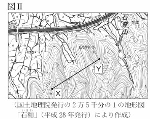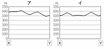 (b) 山梨県の甲府盆地では、ぶどうなどの果樹栽培がさかんである。図Ⅱは、山梨県甲州市のある地域を示した地形図の一部である。次のア〜エのうち、図Ⅱ中のXとYとを結ぶ線が通る地点の標高を断面図で表したものとして最も適しているものはどれか。一つ選び、記号を○で囲みなさい。ただし、断面図は、水平距離に対して垂直距離は約1.5倍で表している。