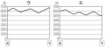 最後にXから標高があがり、谷が二つあることからエが正しいと分かります。