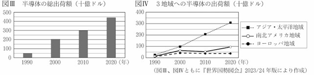 ③ 先端技術産業をはじめとするさまざまな産業において、半導体が用いられている。図Ⅲは、1990年から2020年までの10年ごとにおける、世界のおもな半導体の製造企業(以下「製造企業」という。)の総出荷額を示したものである。図Ⅳは、図Ⅲで示した製造企業の総出荷額について、アジア・太平洋地域、南北アメリカ地域、ヨーロッパ地域(以下「3地域」という。)それぞれへの出荷額の内訳を示したものである。あとのア〜エのうち、図Ⅲ、図Ⅳから読み取れる内容についてまとめたものとして正しいものはどれか。二つ選び、記号を○で囲みなさい。
