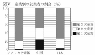 Jさんの班は、世界各国の産業別の就業者数や生産額に興味をもち、アメリカ合衆国、中国、日本(以下「3か国」という。)について調べた。2021(令和3)年の3か国について、図Ⅴは総就業者数に占める産業別の就業者の割合を、表Ⅰは総就業者数を、表Ⅱは産業別の国内総生産をそれぞれ示したものである。あとの文は、図Ⅴ、表Ⅰ、表Ⅱから読み取れることをまとめたものの一部である。文中の[ a ]〜[ c ]に当てはまる語の組み合わせとして正しいものはどれか。あとのア〜カから一つ選び、記号を○で囲みなさい。