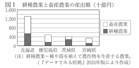 ① 農業は自然環境とのかかわりが深い。図Ⅰは、2021(令和3)年の農業産出額上位4道県である北海道、鹿児島県、茨城県、宮崎県それぞれにおける耕種農業と畜産農業の産出額を示したものである。次のア〜エの道県のうち、耕種農業の産出額が畜産農業の産出額を上回っているものはどれか。一つ選び、記号を○で囲みなさい。