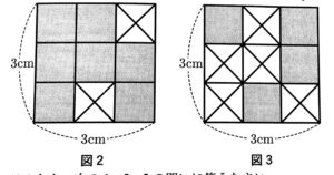 例えば、n=3の場合について考えるとき、図2は黒いタイルを7枚、知問いタイルを8枚、合計15枚のタイルを使って板にタイルをしきつめたようすを表しており、図3は黒いタイルを4枚、白いタイルを20枚、合計24枚のタイルを使って板にタイルをしきつめたようすを表している。
