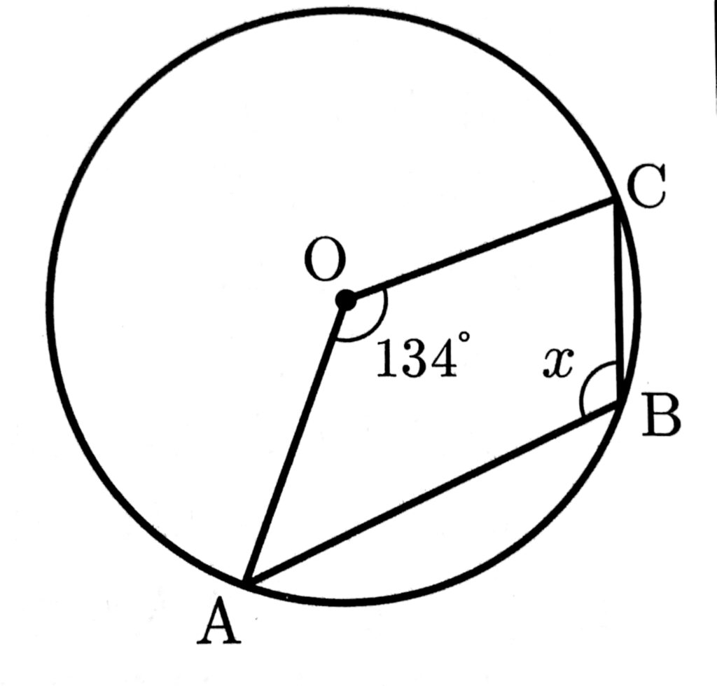(7)点Bを含まない弧AC上の点をDとする。 円周角の定理より、$\angle\text{ADC} = \frac{1}{2}\angle\text{AOC} = \frac{1}{2} \times 134^\circ = 67^\circ$ $\angle x = 180^\circ – \angle\text{ADC} = 180^\circ – 67^\circ = 113^\circ$