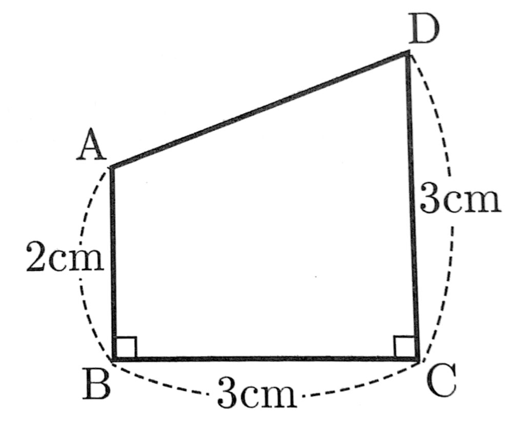 (2)次の図は、AB=2cm、BC=3cm、CD=3cm、∠ABC=∠BCD=90°の台形ABCDである。このとき、次の(1)(2)の問いに答えなさい。