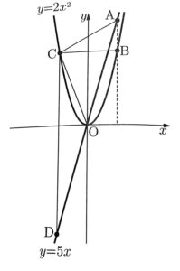 (1)次の図のように、2つの関数$y=5x,y=2x^2$のグラフ上で、x座標がt(t>0)である点をそれぞれA,Bとする。Bを通りx軸に平行な直線が、関数$y=2x^2$ぼグラフと交わる点のうち、Bと異なる点をCとする。また、Cを通りy軸に平行な直線が、関数$y=5x$のグラフと交わる点をDとする。