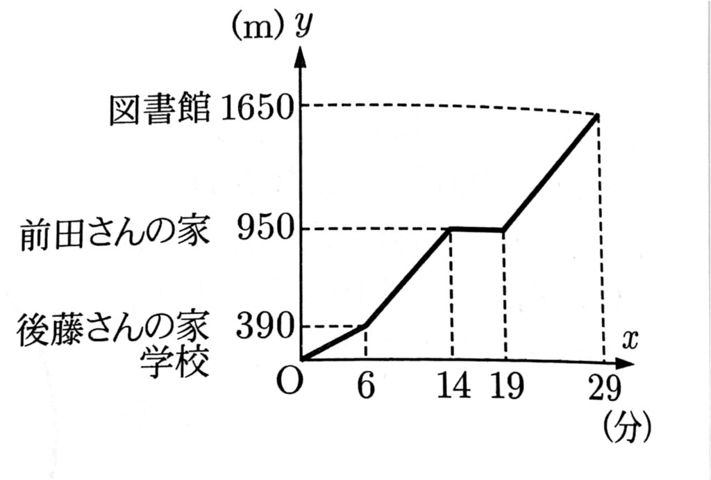 (3)次の図は、前田さんが図書館に着くまでのようすについて、学校を出てからの時間をx分、学校からの距離をymとして、xとyの関係をグラフに表したものである。