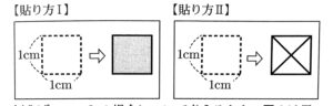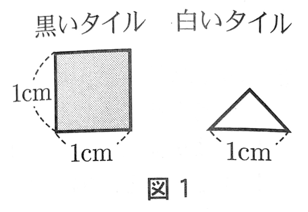 辺の長さがncm(nは2以上の整数)の正方形の板に、図1のような1辺の長さが1cmの正方形の黒いタイル、または斜辺の長さが1cmの直角二等辺三角形の白いタイルを貼る。板にタイルを貼るときは、黒いタイルを1枚使う【貼り方Ⅰ】、または白いタイルを4枚使う【貼り方Ⅱ】を用いて、タイルどうしが重ならないように板に隙間なくタイルをしきつめることとする。