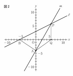 ア \(y = -\displaystyle\frac{3}{2}x – 4\)右の図2は、図1において、点Pのx座標が正の数のとき、x軸上にありx座標が点Pのx座標と等しい点をQとし、点Aと点B、点Aと点Q、点Pと点Qをそれぞれ結んだ場合を表している。
