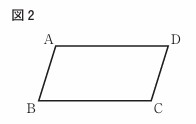 右の図2で、四角形ABCDは平行四辺形である。解答欄に示した図をもとにして、辺AD上にあり、頂点B、頂点Cまでの距離が等しい点Pを、定規とコンパスを用いて作図によって求め、
