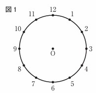 右の図1のように、円Oの円周を12等分する点に、1から12までの自然数の番号を、小さい順で時計回りに付ける。1から12までの番号を付けた点のうち、2点を結んでできる線分が円Oの直径となるとき、その2点を向かい合う点とする。