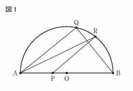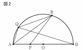 右の図1で、点Oは線分ABを直径とする半円の中心である。点Pは、線分OA上にある点で、点O、点Aのいずれにも一致しない。