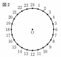 1から24までの番号を付けた点のうち、2点を結んでできる線分が円Oの直径となるとき,その2点を向かい合う点とする。