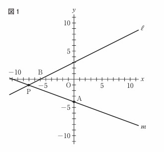 右の図1で、点Oは原点、点Aの座標は(0, -4)であり、直線lは一次関数 \(\displaystyle y = \frac{1}{2}x + 3\) のグラフを表している。