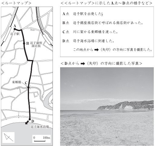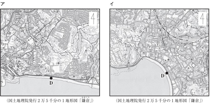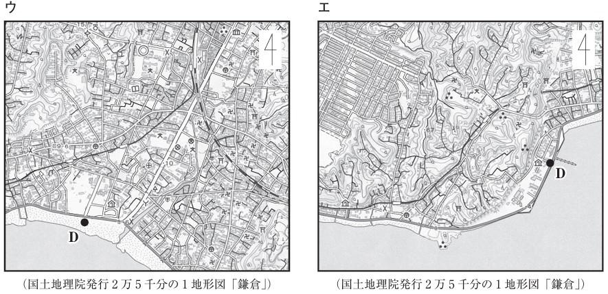 次の野外観察ノートは、神奈川県逗子市の逗子海水浴場周辺の様子を記録したものである。野外観察ノート中の<ルートマップ>にD点として示されている地点と同一の地点が含まれている地形図に当てはまるのは、次のページのア〜エのうちではどれか。