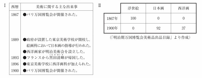 (3)伝統的な美術は、海外から高く評価されるとともに、欧米の表現技法が取り入れられた。とあるが、次のⅠの略年表は、江戸時代末期から明治時代にかけての美術に関する主な出来事をまとめたものである。Ⅱの表は、1867年と1900年に開催された万国博覧会において、日本から出品された絵画の出品数を示したものである。日本から出品された絵画の出品数の変化について、ⅠとⅡの資料を活用し、政府が設置した学校に着目して、簡単に述べよ。