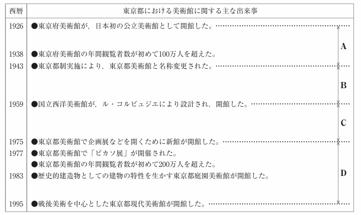 (4)美術品の展示や鑑賞を目的として作られた美術館は、作品の収集や保存、研究などの役割も果たすようになり、文化の大衆化に寄与した。とあるが、次の略年表は、大正時代から平成時代にかけての、東京都における美術館に関する主な出来事をまとめたものである。略年表中のA〜Dのそれぞれの時期に当てはまるのは、下のア〜エのうちではどれか。