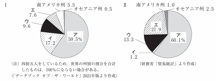 (3)世界の人口が拡大する中で、相互に発展することを目指し、調和のある貿易が期待されている。とあるが、次のⅠとⅡのグラフのア〜エは、アジア州、アフリカ州、ヨーロッパ州、北アメリカ州のいずれかの州に当てはまる。Ⅰのグラフは、2020年における世界の人口に占める世界の州別の割合を示したものである。Ⅱのグラフは、2020年における日本の輸出額に占める世界の州別の割合を示したものである。アフリカ州に当てはまるのは、ⅠとⅡのグラフのア〜エのうちのどれか。