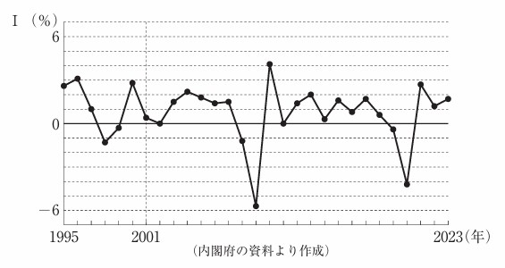 (3)経済の安定化を図る政策を実行することは、政府と日本銀行の役割の一つである。とあるが、次のページのⅠのグラフは、1995年から2023年までの我が国における経済成長率の推移を示したものである。次のページのⅡの文章は、2001年の勤労者世帯における消費支出と実収入についてまとめたものである。次のページのA〜Dは、好景気(好況)のとき、あるいは、不景気(不況)のときの政府による財政政策及び日本銀行による金融政策に関する一般的な説明である。ⅠとⅡの資料から、2001年の経済状況のようなときの政府による財政政策と日本銀行による金融政策に関する一般的な説明として正しく組み合わせているのは、次のページの表のア〜エのうちではどれか。